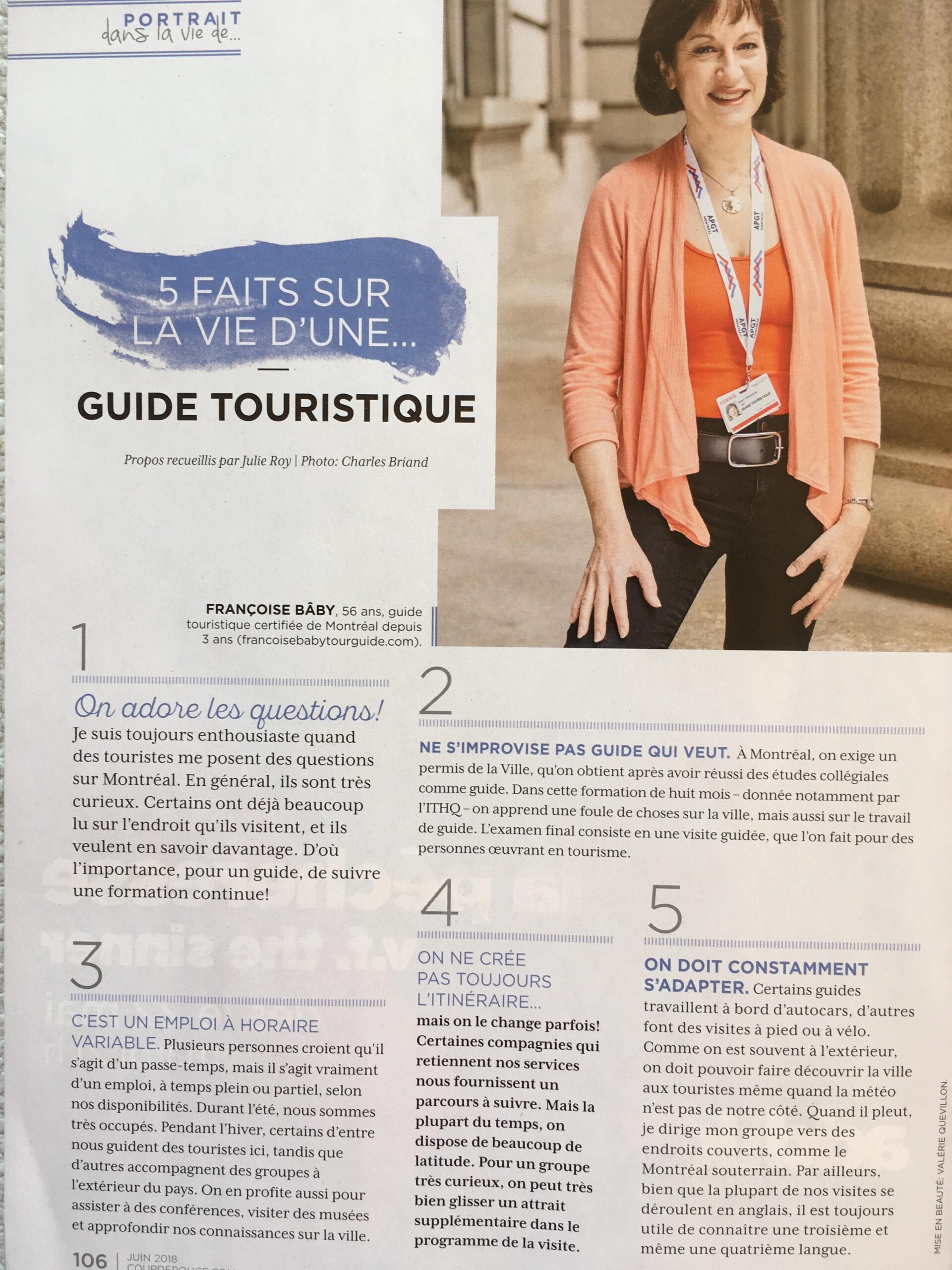 Nous avons découvert des trésors à Montréal suite à notre visite guidée avec Françoise, le mille-pattes. Elle a des connaissances de la ville hors du commun. Nous apprécions sa générosité, ses anecdotes et sa gentillesse... Quelle guide formidable!